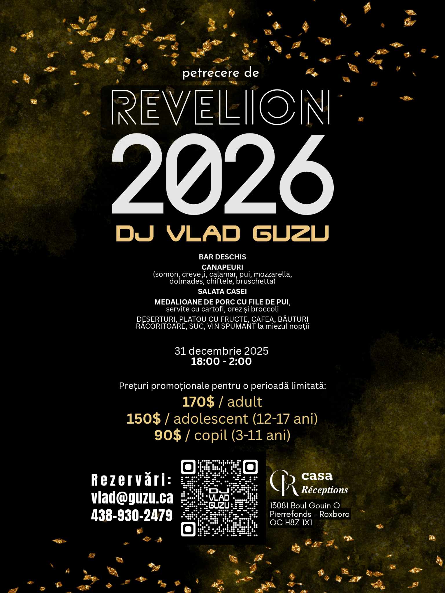 Pentru a va rezerva locurile, puteti plati in numerar, sau trimite un eTransfer la vlad@guzu.ca cu suma totala mentionand in mesaj pentru cati adulti, adolescenti si copii. |